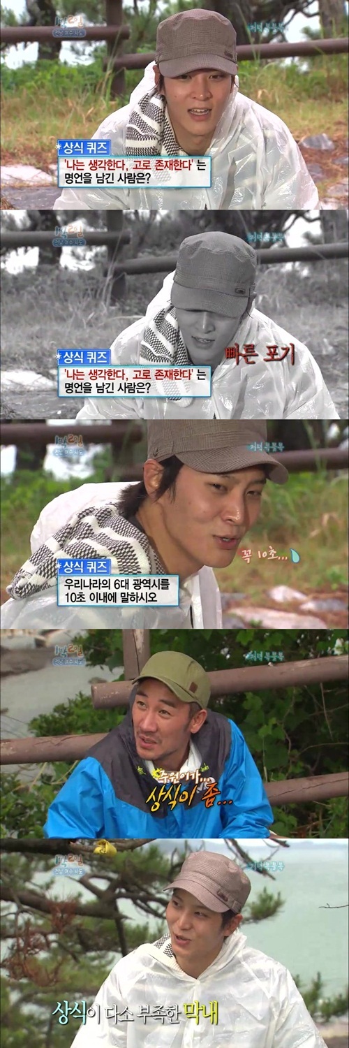 첫 타자로 나선 주원은 ‘나는 생각한다. 고로 존재한다’라는 명언을 남긴 사람의 이름을 답해야 했고, 문제를 듣자마자 큰 한숨을 쉬며 빠르게 포기하는 모습을 보여 웃음을 자아냈다. 빠르게 실패한 그는 자신의 차례가 돌아왔을 때 다시 전속력으로 언덕 꼭대기에 달려갔지만 ‘우리나라 6대 광역시를 10초 이내에 말하라’라는 문제에 당황함을 감추지 못하며 “꼭 10초야만 하냐”라고 투정을 부리기도 했다.