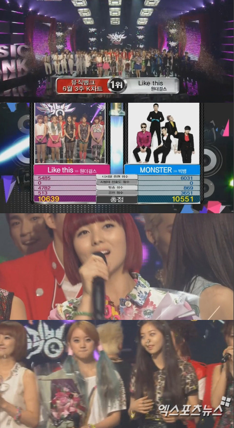 원더걸스는 15일 생방송된 KBS 2TV '뮤직뱅크'에서 타이틀곡 '라이크 디스'로 빅뱅의 '몬스터'를 제치고 1위에 올랐다.
