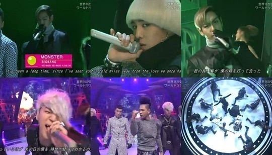 빅뱅은 지난 17일 방송된 일본 NHK '뮤직재팬' 음악 방송 프로그램에 출연, 신곡 '몬스터'의 무대를 펼쳤다. 이들은 '몬스터'를 일본어 버전으로 열창했으며 뮤직비디오에서 본 것과는 사뭇 다른 신선한 퍼포먼스를 펼쳤다.