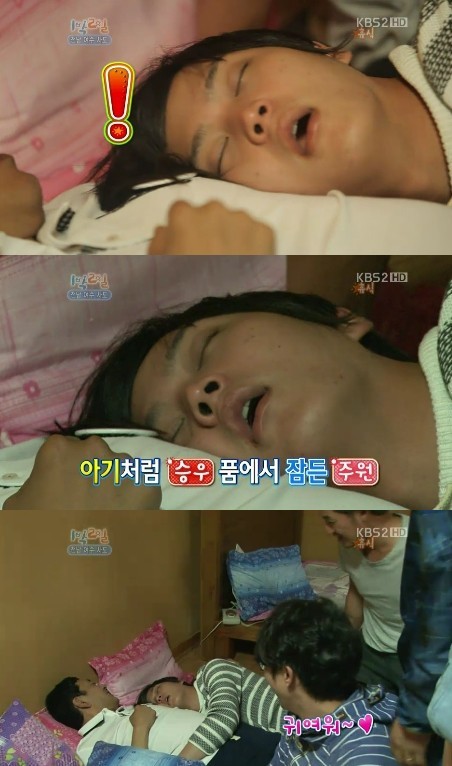 노래를 부르며 장난을 치던 멤버들은 김승우의 품에 안겨 입을 벌린 채 곤히 잠든 주원의 모습을 발견했고, 이를 보며 연신 귀엽다는 반응을 선보여 웃음을 자아냈다.