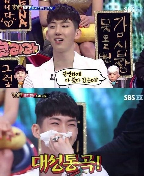 조권의 이야기를 듣던 방송인 붐은 갑자기 “스튜디오에 누군가 와 있다. 보고 싶다고 외쳐보라”라고 말했다. 처음에 “엄마”라고 장난스럽게 외치던 조권은 이내 “2AM”이라고 외쳤고 멤버 진운이 스튜디오에 등장하자 눈물을 감추지 못했다.