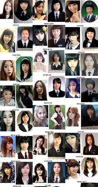 미쓰에이의 수지, 에프엑스의 설리 등은 풋풋한 학생 때와 똑같은 ‘모태 미모’를 뽐내고 있어 눈길을 끌었다. 그렇지만 몇몇 아이돌 멤버들은 이전 모습을 찾아보기 힘들 만큼 졸업사진에 비해 확연히 예뻐진 모습이다.